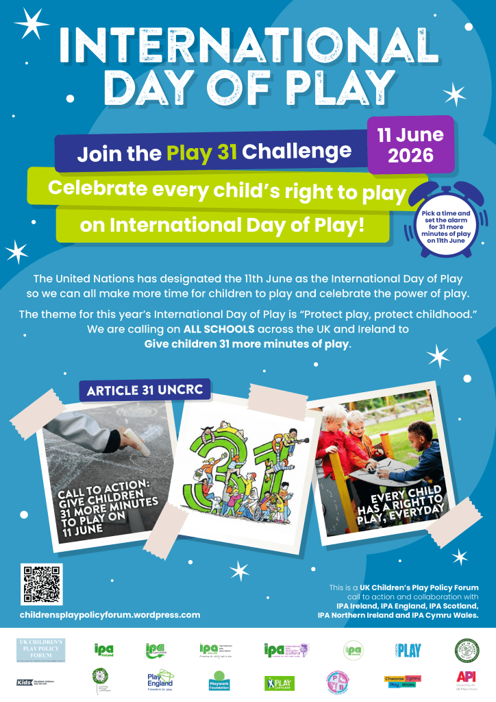 This call to action has been launched by the UK Children’s Play Policy Forum, working in collaboration with IPA Cymru Wales, IPA England, IPA Ireland | Éire, IPA Northern Ireland, and IPA Scotland. It marks the third annual United Nations International Day of Play which aims to elevate the importance of play in children’s lives and to protect the conditions that make play possible.
